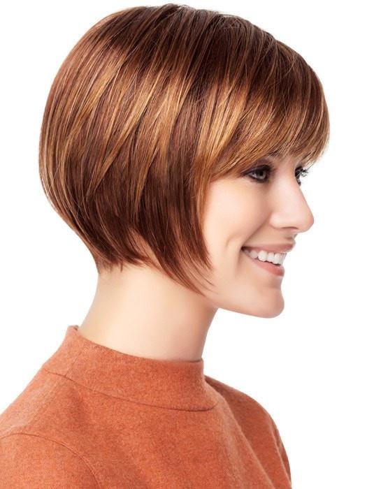 Folly by Gabor is a short wig. smooth bob featuring full bangs and sleek. chin-length sides that are angeled cut up to blend with a short. neck hugging nape.