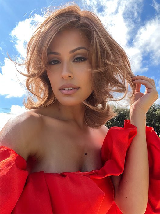 Goddess by has a Sheer Indulgence for the option of off-the-face styling and a top for varied parting choices. This barely waved. layered. shoulder length silhouette can also be curled for a more dramatic effect. This style is very much like Raquel’s own natural hair… the Goddess herself!