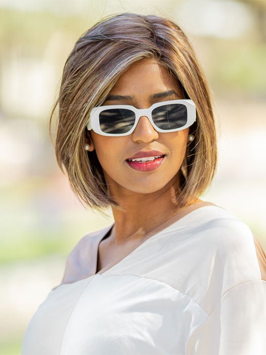 Meritt from the High Society Collection by is a sleek. smooth bob with perfect blunt layers. The monofilament top and lace front create the appearance of a natural hairline.