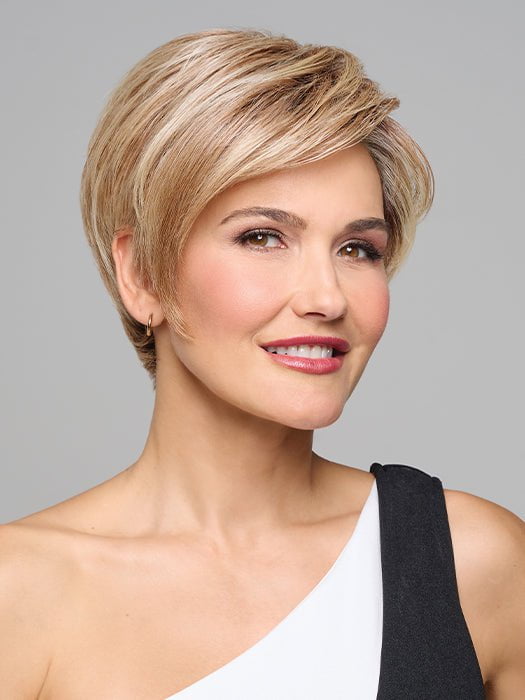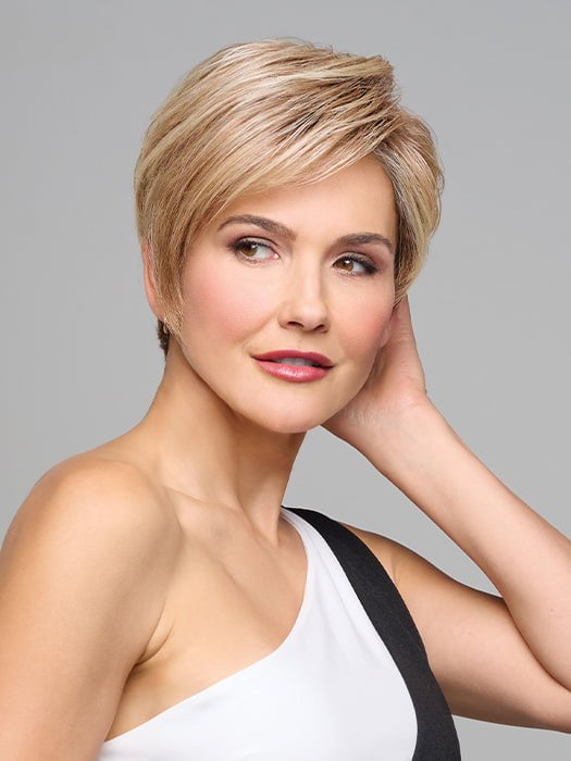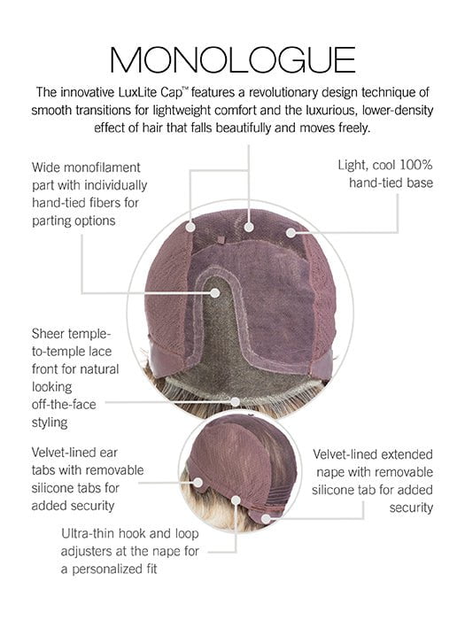 Monologue by Raquel Welch is part of their Sheer Luxury Collection. This heat friendly synthetic wig features a classic cropped hairstyle with soft. razor cut layers and asymmetrical fringe for a contemporary hairstyle. The LUXLITE cap is ultra lightweight and comfortable with its monofilament part and 100% hand tied base. The temple to temple lace front gives you a realistic-looking hairline.