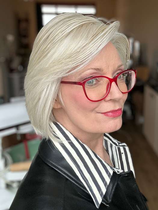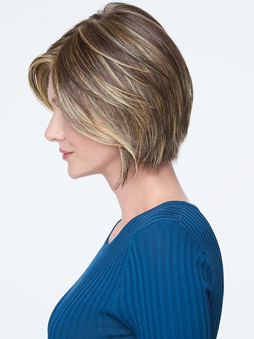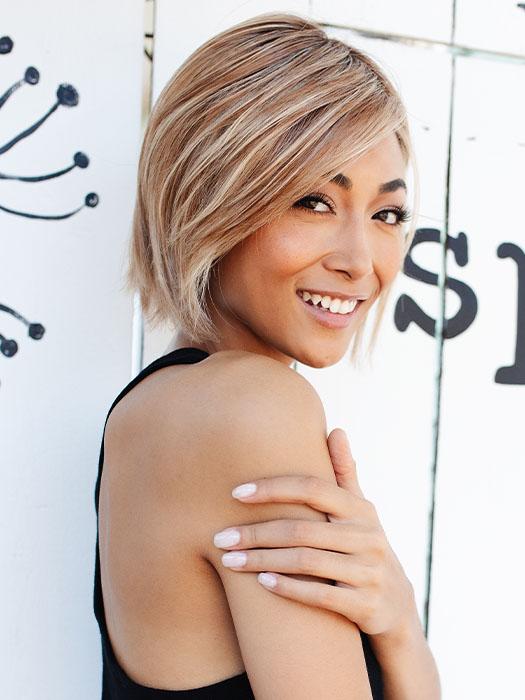 Real Deal by features shattered ends and razor-cut lengths to give this modern bob both popular and practical appeal. The close fitting nape and flattering eyelash bang work together to create a confident look that’s also very feminine. Heat style the ends turned under or with a sassy upwards flick. Try wearing with one side tucked behind the ear.