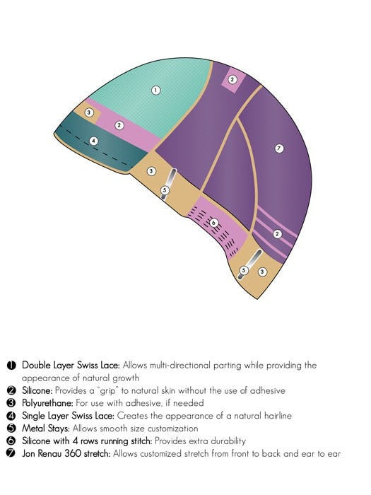• Silicone – Provides a grip to the skin on your scalp with or without the use of adhesive.
