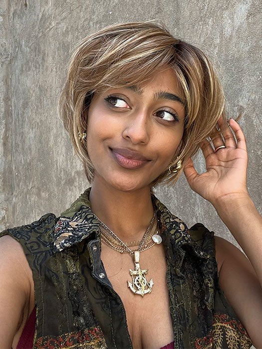 Stella Star by Jon Renau is part of the HD Collection. Designed by Jon Renau’s co-founder and designer Stella Reynolds. this short heat friendly wig sports a sleek bob haircut with longer hair in the nape area. The hair is designed with heat resistant synthetic fiber. so you can smooth out the hair or flip out the ends for more texture. Its low permatease and lace front create a realistic appearance.