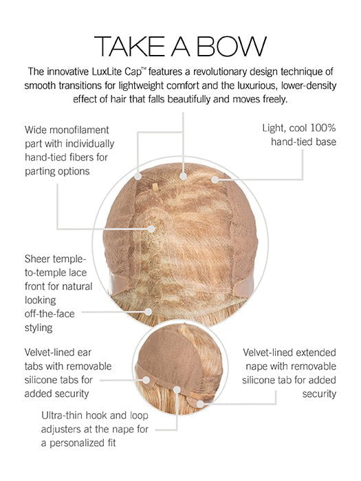 Take a Bow by Raquel Welch is part of their Sheer Luxury Collection. This elegant synthetic wig takes center stage with its soft layered haircut and shoulder length. The Tru2Life heat friendly synthetic fiber allows you to create new and fabulous looks. The LuxLite Cap has a 100% light hand tied base and wide hand tied monofilament part for a natural look and comfortable feel.