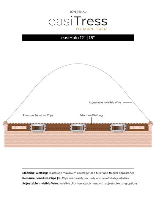 The easiHalo 12 human hair extension by Jon Renau gives you gorgeous volume and length in seconds! Made with 100% Chinese Human Hair. this halo features a luxurious layered cut that is designed to seamlessly integrate into your bio hair. This halo hair extension offers discreet wear with its adjustable invisible wire that encircles your head for a secure fit. The wire vanishes into your hair. leaving behind flawless. beautiful hair! Easy to use and easy to wear! Also available in and lengths.