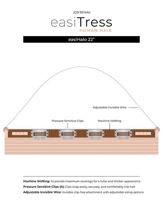 The easiHalo 22 human hair extension by Jon Renau is a handmade halo extension that features 100% Chinese Human Hair cut into a fabulous layered hairstyle. The gradual layered design allows the hair to blend into your bio hair for extra volume. The no show wire is adjustable for a customizable and secure fit. Also available and lengths.