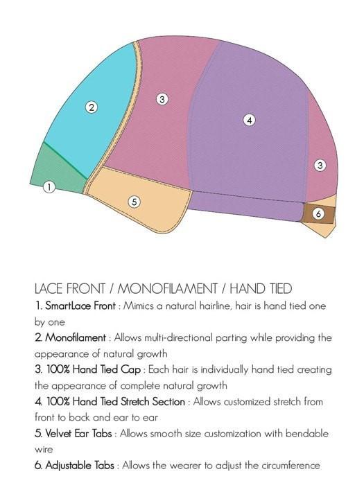 The ready-to-wear SmartLace™ front creates a natural-looking hairline and allows you to style the hair off the face. The hand-tied monofilament top provides multi-directional styling and looks extremely natural up close. The detailed hand-tied cap gives the ultimate look and feel. The heat defiant synthetic fiber is styled straight out of the box but can be curled or waved.