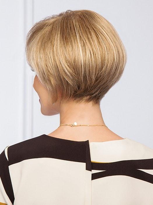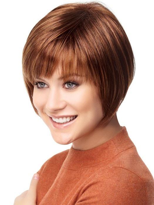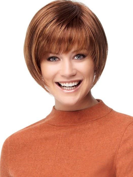 Folly by Gabor is a short wig. smooth bob featuring full bangs and sleek. chin-length sides that are angeled cut up to blend with a short. neck hugging nape.