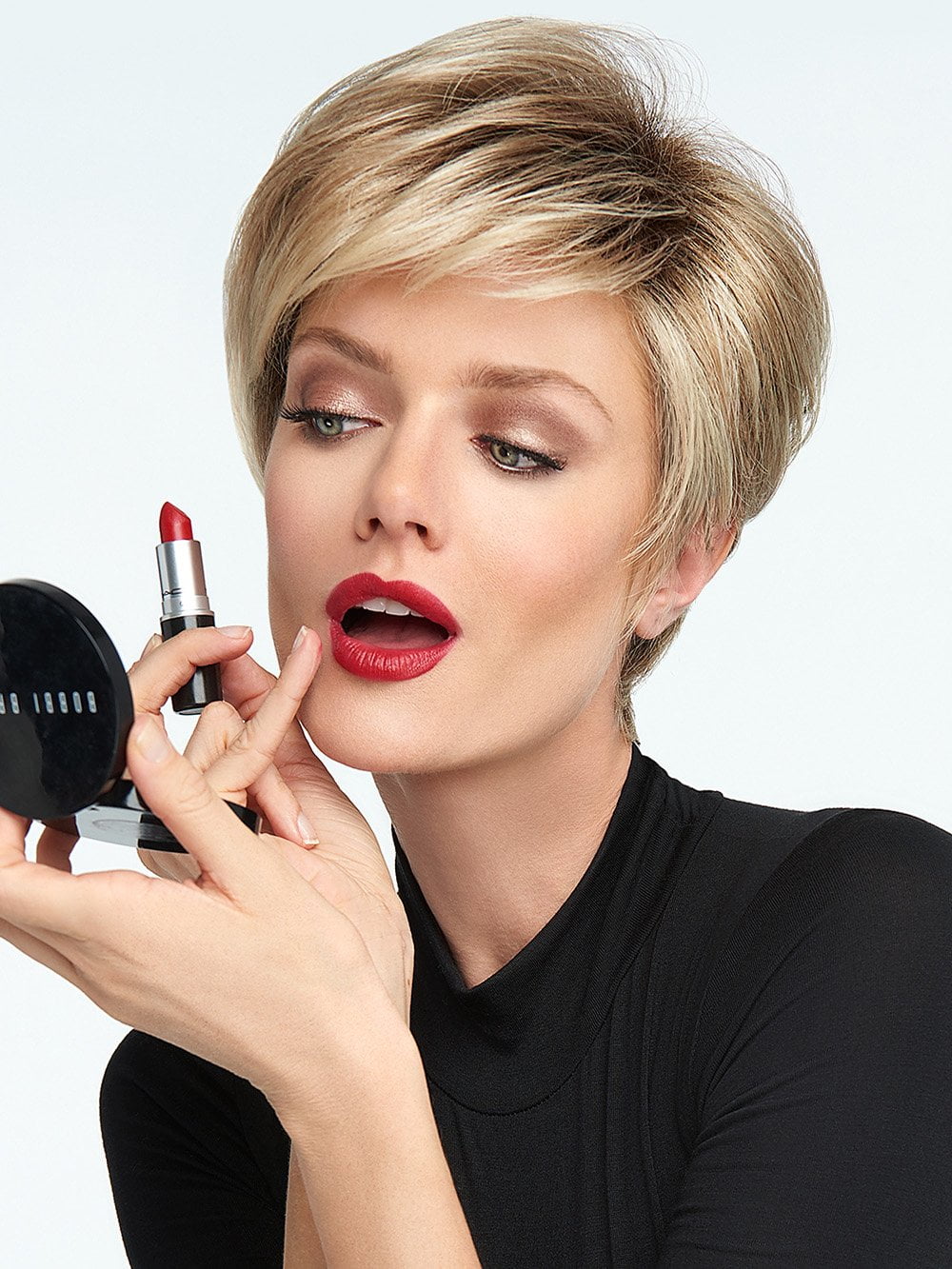 Go For It by takes the classic and gives it a complete overhaul with the addition of longer layered areas at the front and sides for more styling options. Thanks to the Sheer Indulgence™ temple-to-temple lace front. the piecey front lengths can be styled off- the- face. The longer. textured sides can be worn swept forward for a voluminous look or gently finger-styled behind the ears for a more streamlined effect. A gently sculpted and textured nape adds to the sophisticated look of this style.