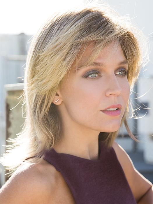 Rene of Paris Jade is feathery. out-flipped layers lend a retro finish to this shoulder length hair style.