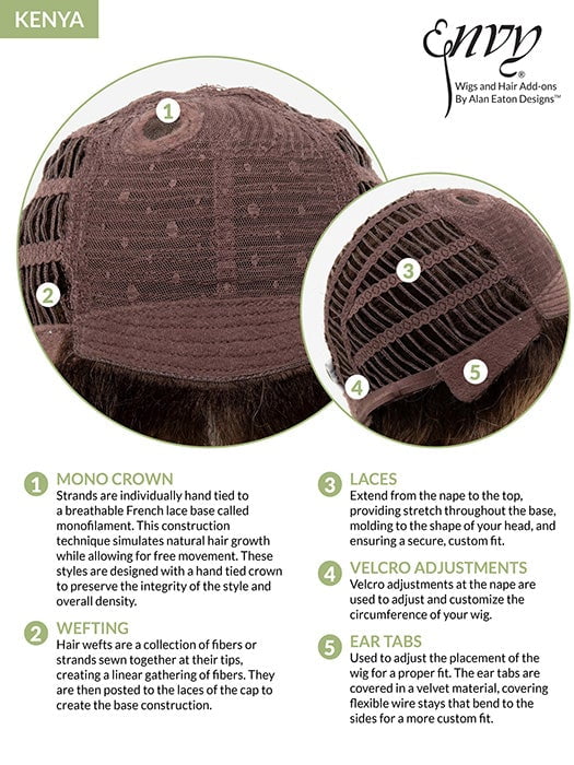 With a full head of bouncy curls. Kenya Wig by Envy has chin-length ‘do gives you volume for days. Her mono crown construction gives this wig one of the most natural appearances available. so you can run your fingers through those curls without revealing a thing.