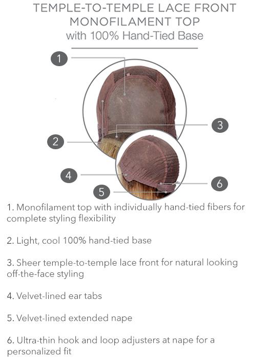 - Sheer Indulgence™ Monofilament Top – Fibers are individually knotted to create the illusion of natural hair growth where the hair is parted and allows you to part the hair in any direction.