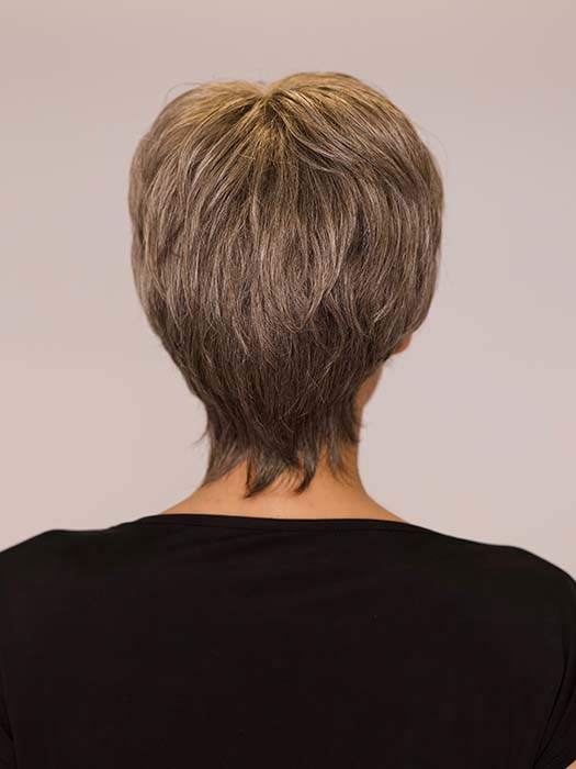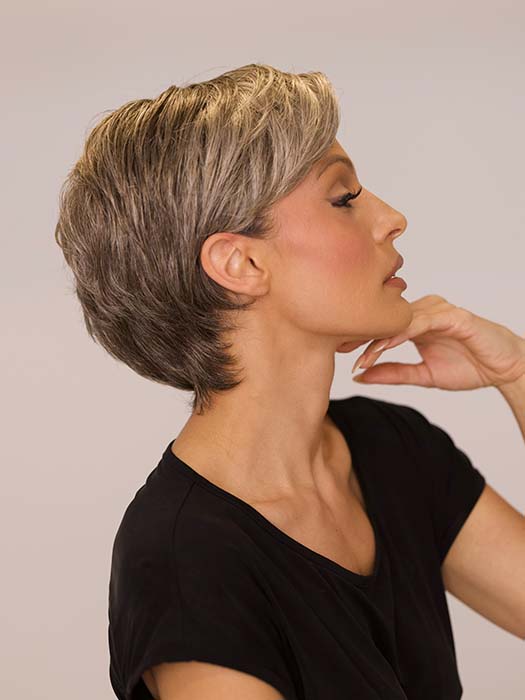 Modena by Ellen Wille is from their Modixx Collection. This short wig features an edgy pixie cut with stylish long layers in the crown area and gently tapered back. The longer nape area lends a graceful. blended look. This synthetic hair wig has a full monofilament top and lace front to provide a natural look. The back of the cap is wefted for breathability and lasting comfort.