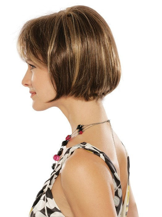 Sandra wig by Estetica Designs Wigs is a silky chin length page bob-cut wig. combined with layers and a bang. Sandra has a monofilament top that allows natural parting in any direction.
