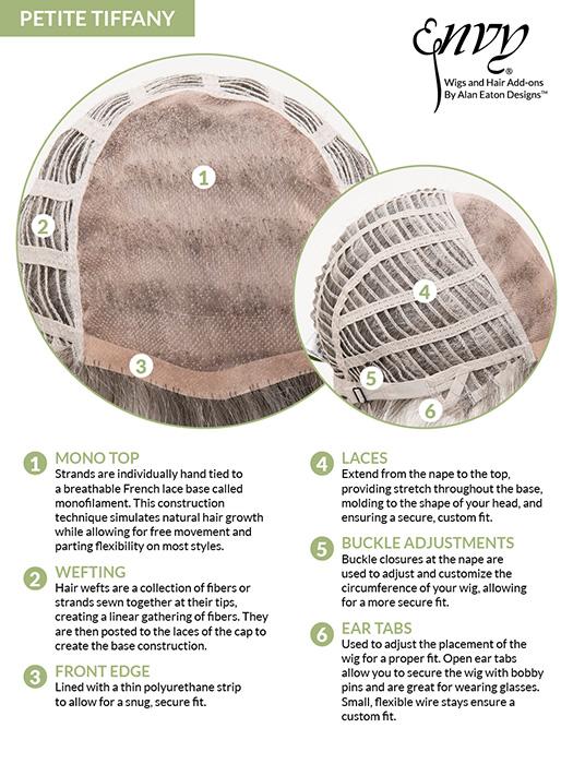 Tiffany Petite by Envy is a short. layered. and pixie cut synthetic wig. You can style it smooth and soft or tousled and spiky. The full-layered bang can be trimmed by your stylist or worn slightly off to the side. To add a natural look with movement. the cap features a monofilament top. You can change the style and texture by applying the . Tiffany is also available in .
